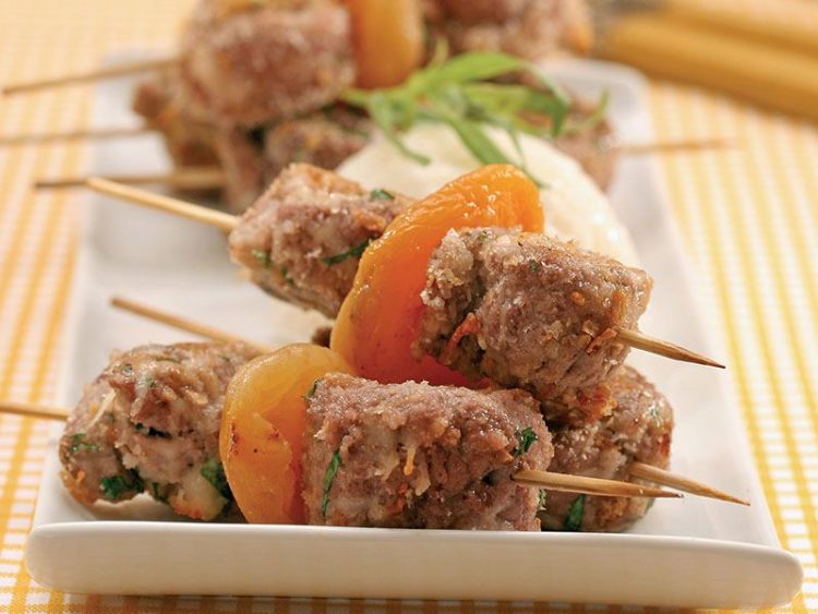 - Rulo etleri ikişer ikişer aralarına birer kayısı ilave ederek şişlere geçirin..