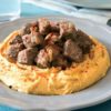 - Şiş köfteleri fırından alıp yoğurtlu pidenin üzerine yerleştirin..
