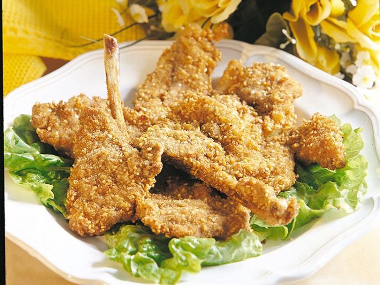 • 800 gr kuzu pirzola 2 limonun suyu 2 yumurta akı 5 çorba kaşığı galeta unu 3 çorba kaşığı susam 1 çay bardağı sıvıyağ Nane