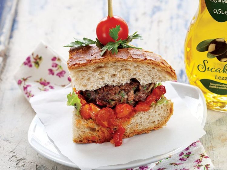 - Malzemeyi dört eşit parçaya ayırıp yuvarlak, yassı büyük köfteler hazırlayın..