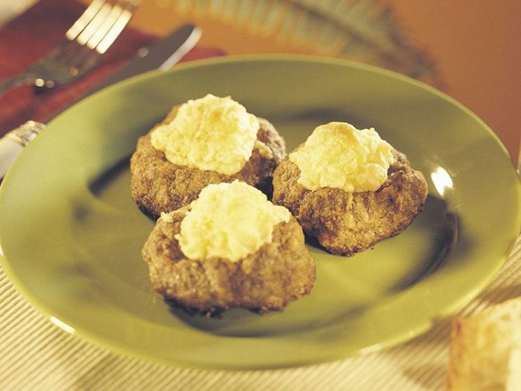 Köfteleri fırından çıkarıp çukur yerlerine patates püresini paylaştırın.. - Tekrar fırına verip üzerleri kızarıncaya dek 4-5 dakika daha pişirin..
