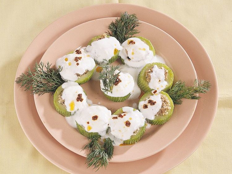 - Sarımsaklı yoğurdu köfteli kabakların üzerine ilave edin..