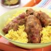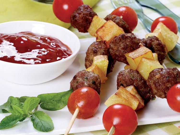 - Çöp şişlere kiraz domates, patates ve köfteleri dizip soslarla servis yapın..