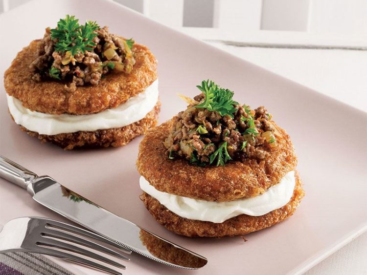 - Üzerlerine kıymalı harçtan ilave edin ve Frenk maydanoz ile süsleyerek servis yapın..