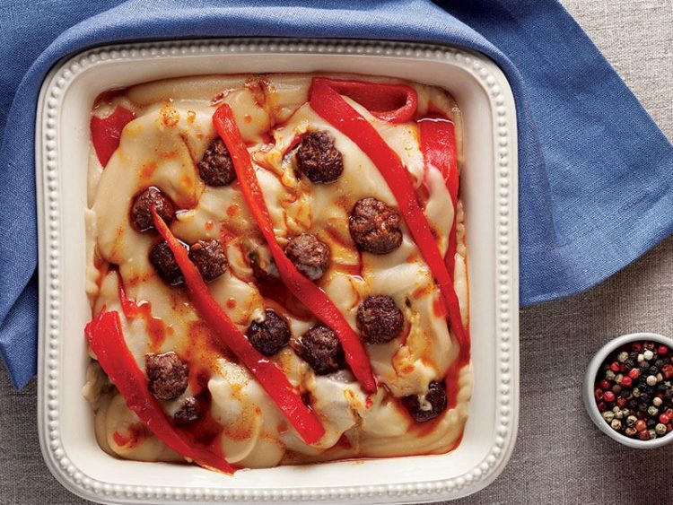 12. Unlu harcı bir tabağa alarak üzerine köfteleri ve soyulmuş kırmızıbiberleri yerleştirin..