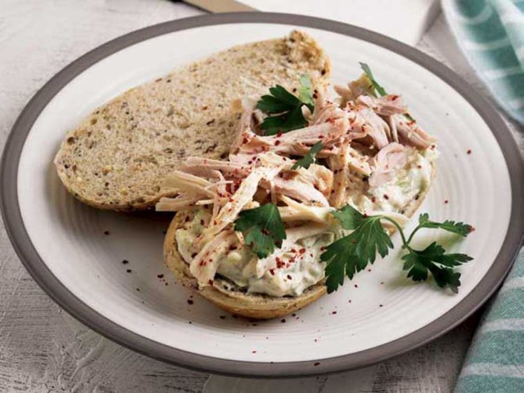 - Sosun üzerine didiklediğiniz tavuk etini paylaştırıp, diğer ekmek parçalarını üzerlerine kapatın..