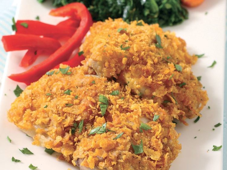 4. Tavuk etlerini önce kremaya sonra mısır gevreğine bulayıp yağlı kağıt serili fırın tepsisine dizin..