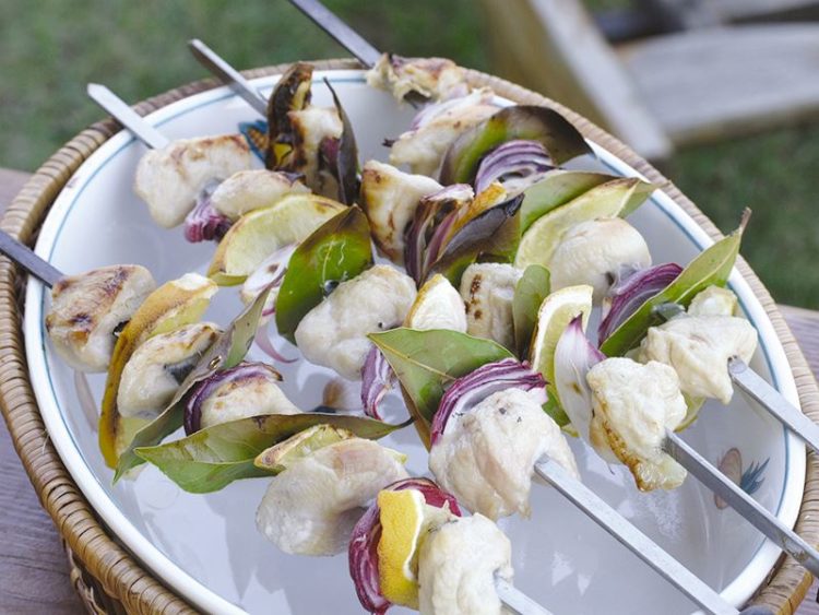 - Tavuk etleri, soğan, limon kabukları ve defne yapraklarını ızgara yapacağınız şişlere özenle dizin..
