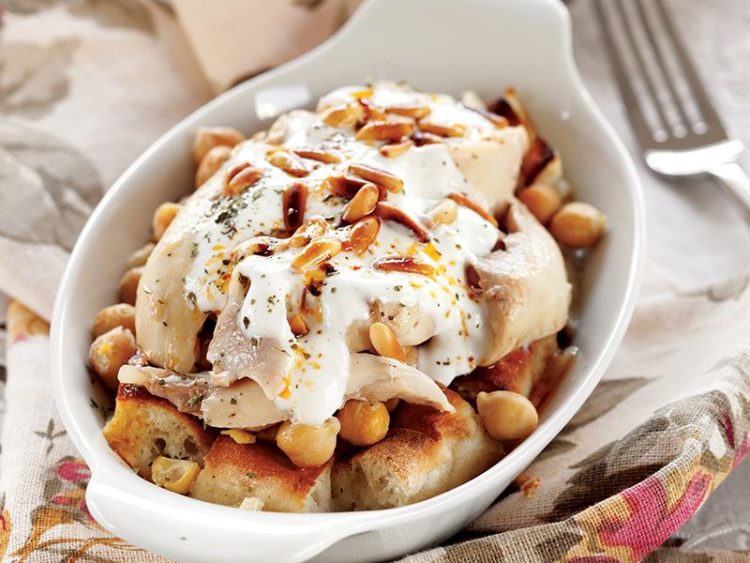 - Üzerine bol sarımsaklı yoğurt, yağsız tavada kavurduğunuz fıstık ve kuru nane serpin..