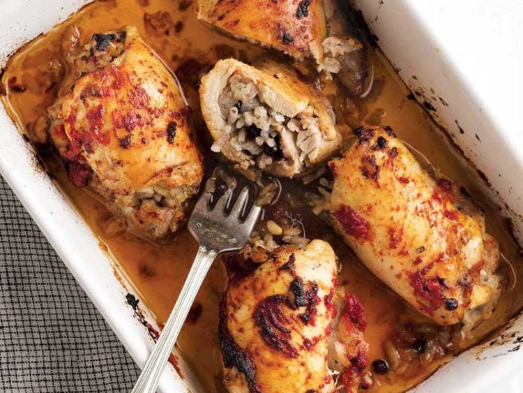 10. 1 tane açılmış tavuk budunu, derisi aşağıya bakacak şekilde ısıya dayanıklı fırın kabına serin..