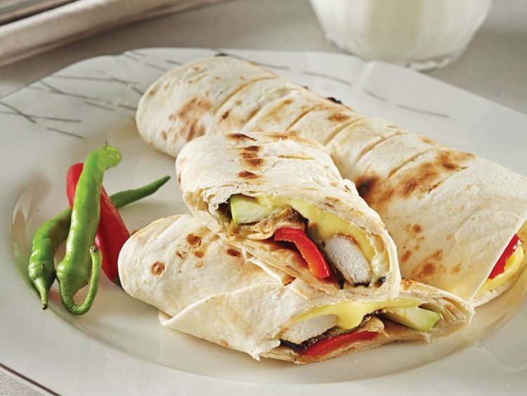 - Lavaş ekmeklerinin üzerine 2 dilim kaşar peyniri, kabak, patlıcan, közlenmiş yarım biber ve tavuk etlerini paylaştırıp sarın..