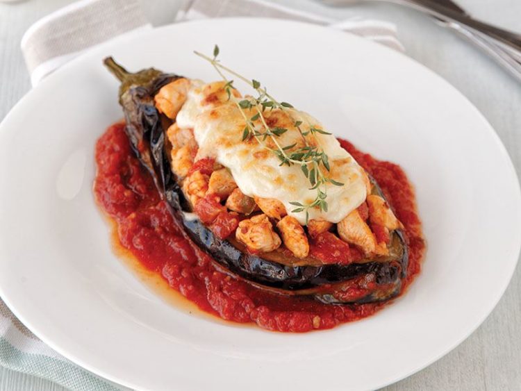 - Patlıcanların üzerine uzunlamasına bıçakla cep açın ve tavuklu karışımı içine paylaştırın..