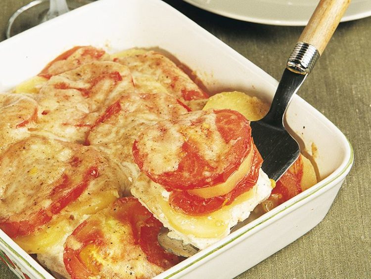 - 500 gr tavuk fileto7 patates7 domates7-8 diş sarımsak1 su bardağı yoğurt2 çorba kaşığı rendelenmiş kaşar peyniri2 çorba kaşığı galeta unu4 çorba kaşığı sıvıyağTuz