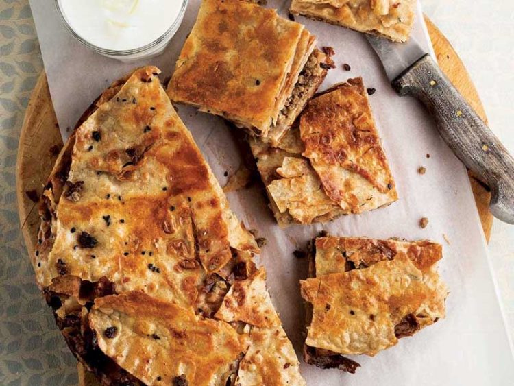 9. Ancak en üstteki yufkayı yağlamadan, üzerine kıymalı harcı eşit miktarda dağıtın..