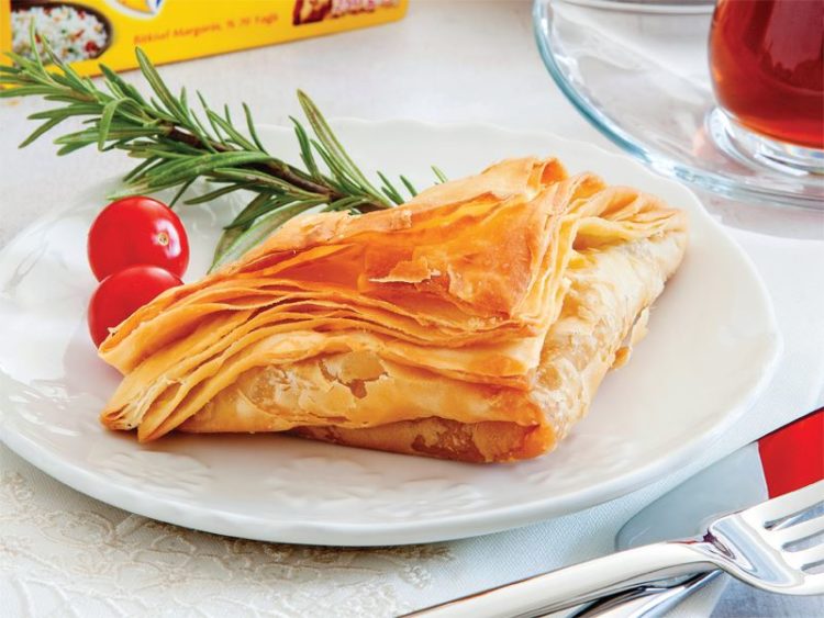 - Hazırlanan üçlü yufkayı incecik açın ve her tarafını eritilmiş Bizim Yağ ile yağlayarak bohça şeklinde kapatın..
