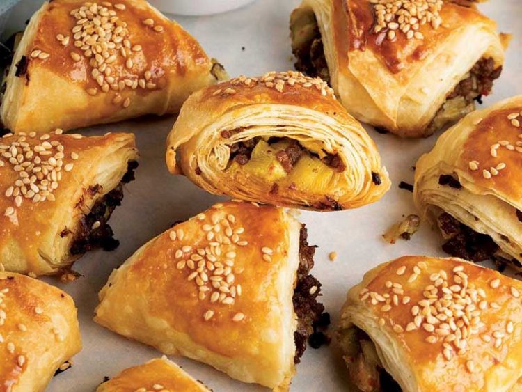 10. Rulo şeklinde sarın ve üçgen şekilde dilimleyerek, yağlı kağıt serili tepsiye dizin..