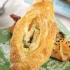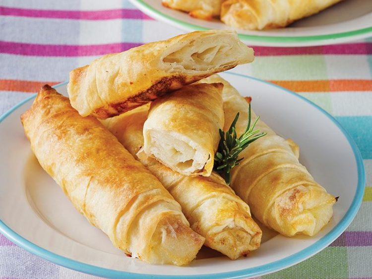 10. Üçgenlerin geniş kenarına peynirli karışımı yayıp iki köşesini içe doğru kapatarak rulo şeklinde sarın..