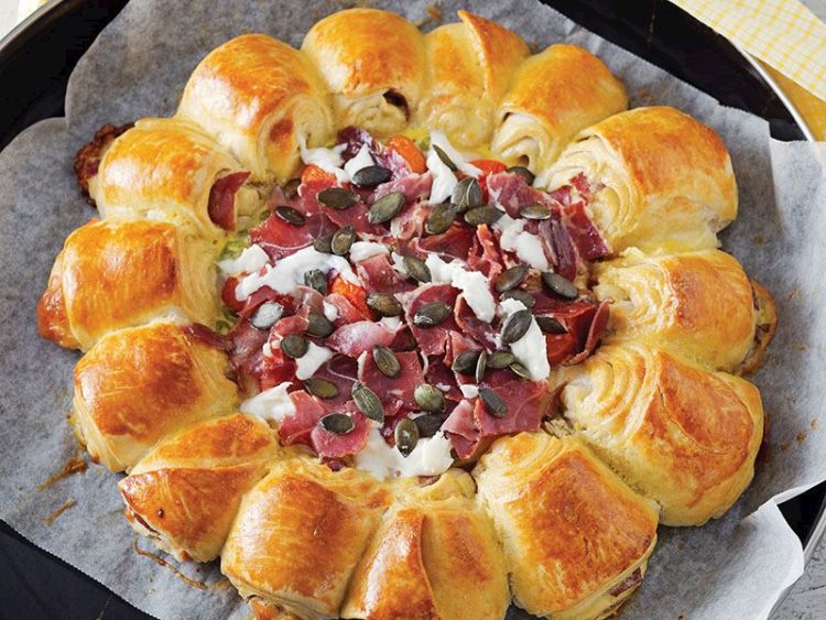 parçanın ortasına mozarella peyniri, pastırma, domates, biber ve kabak çekirdeğini