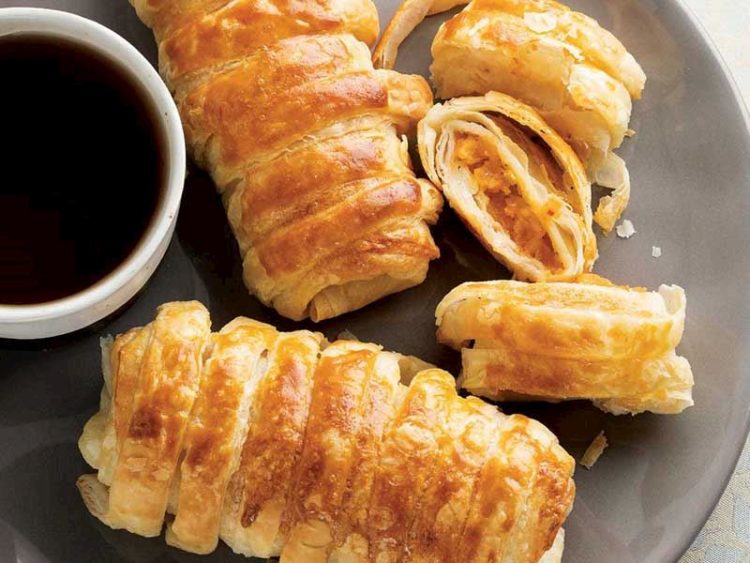 - Sarmış olduğunuz böreğin üzerine milföy şeritlerini dolayın ve yumurta sarısı sürerek, önceden ısıtılmış 180 derece fırında üzeri kızarana kadar pişirin..