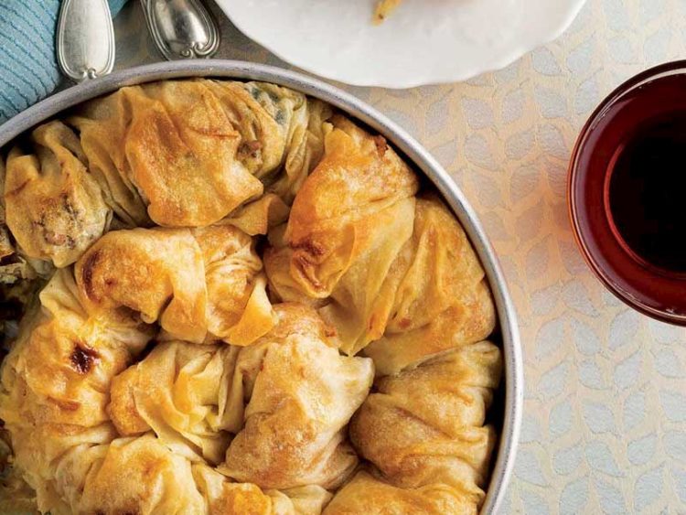 12. Diğer yufkaları da aynı şekilde büzün ve tepsideki böreğinizin etrafına sırayla dolayarak yufkaları tamamlayın..