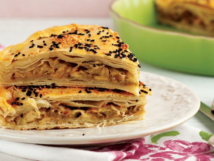 - Üzerine patlıcanlı iç harcından yayıp diğer hamuru da açarak üzerine kapatın..