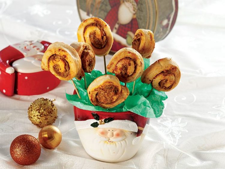 12. Börekler hafifçe ılındıktan sonra tahta çöp şişlerin uçlarına takıp servis yapın..
