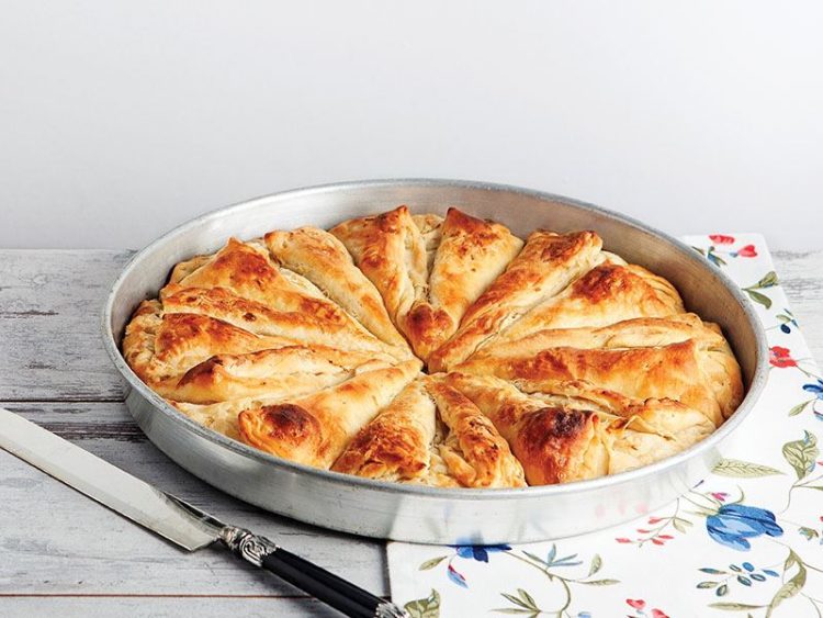10. Diğer yufkaları da aynı şekilde hazırlayıp yağlanmış fırın tepsisine yan yana dizin..