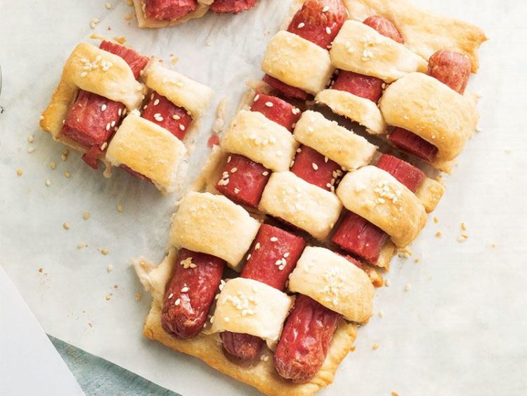 - Sosisleri hamurun üzerine uzunlamasına yerleştirin..