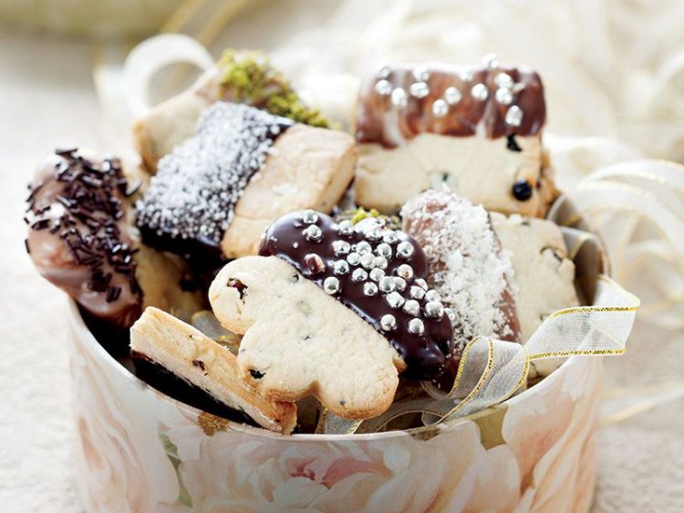 6. Soğuyan kurabiyelerin yarısını eritilmiş çikolata, renkli şekerlemeler, hindistan cevizi ve toz antep fıstığına bulayın..
