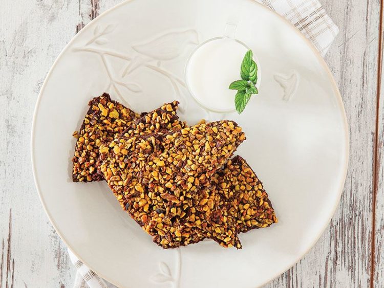 - Üzerine iri çekilmiş Antep fıstığını serpip elinizle hafifçe bastırın..