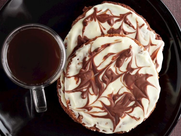 - Soğuyan kurabiyelerin üzerine önce beyaz çikolata, ardından sütlü çikolata koyup bir kürdan yardımıyla dağıtın..