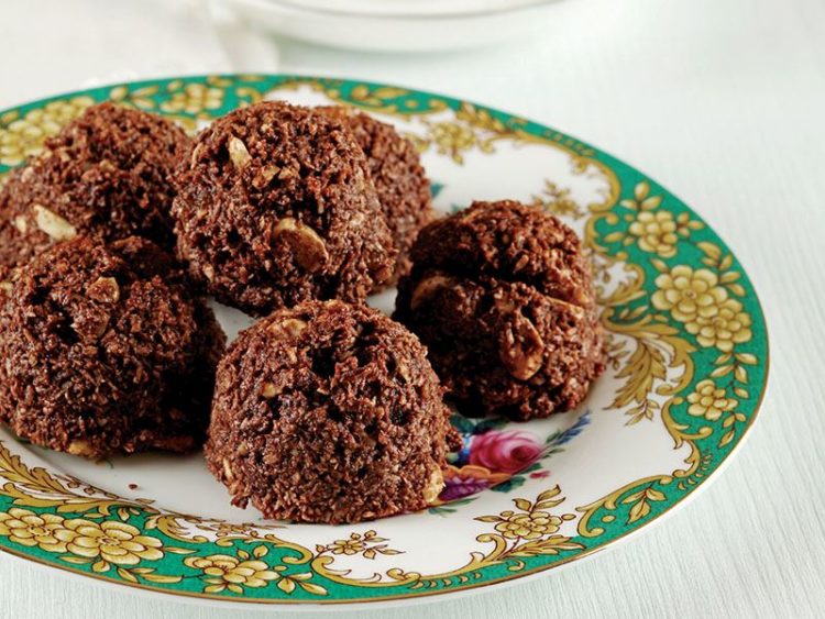 2. Derin bir kapta yumurta akları, hindistan cevizi, pudra şeker, toz fındık, kakao ve kayısıları karıştırın..