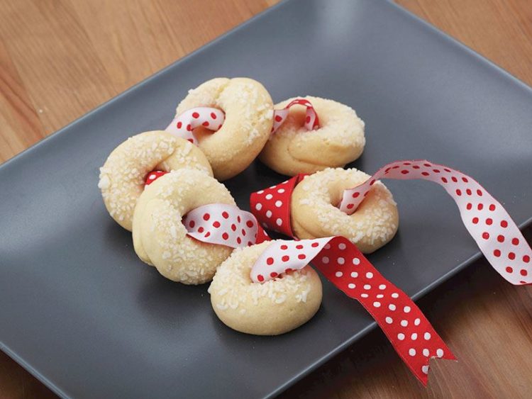 - Hamurdan ceviz büyüklüğünde parçalar kopartarak rulo yapın ve uçlarını birleştirin..