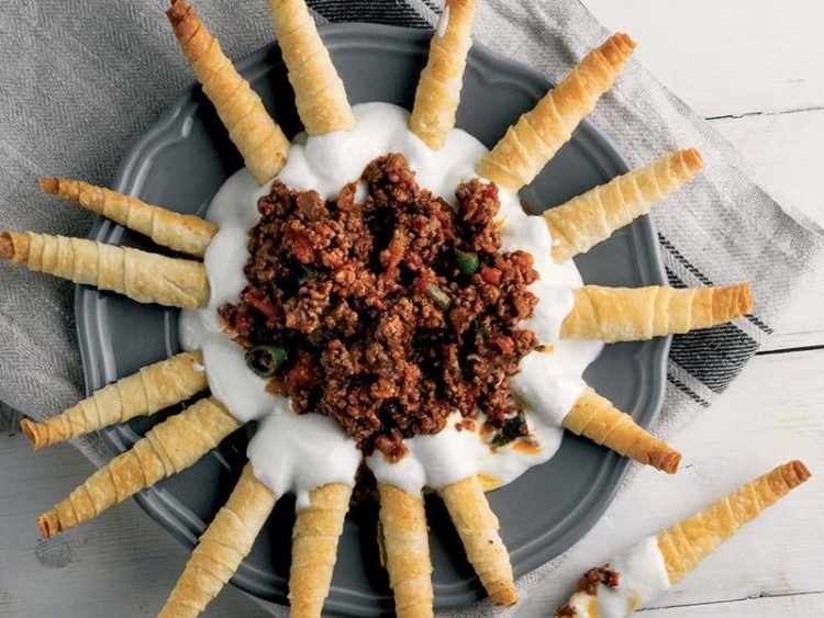 - Üzerine sırasıyla sarımsaklı yoğurt ve kıymalı sos koyun..