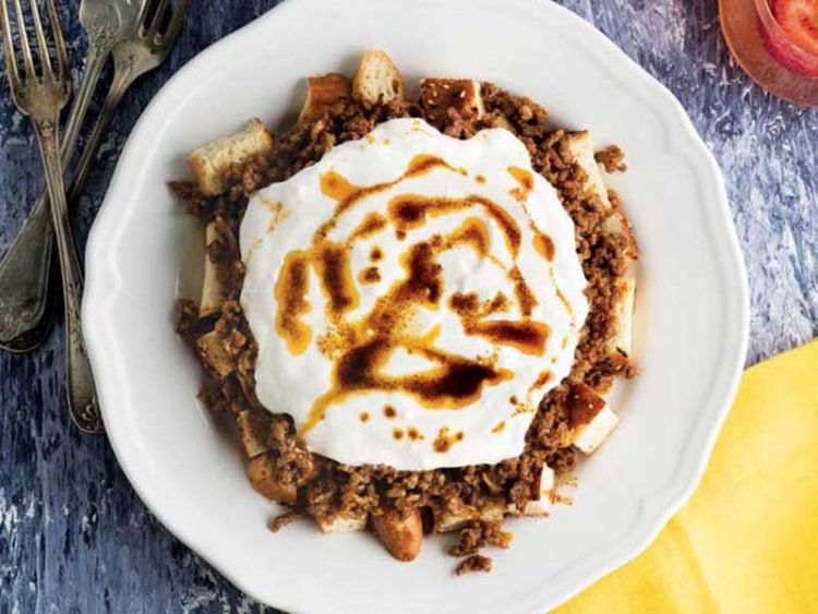 6. Kızarttığınız pideleri servis tabağına alın, üzerine pişirdiğiniz salçalı kıymayı yayıp, üzerine sarmısaklı yoğurt dökün, terayağında hafif kavrulmuş kırmızı toz biberi gezdirin..