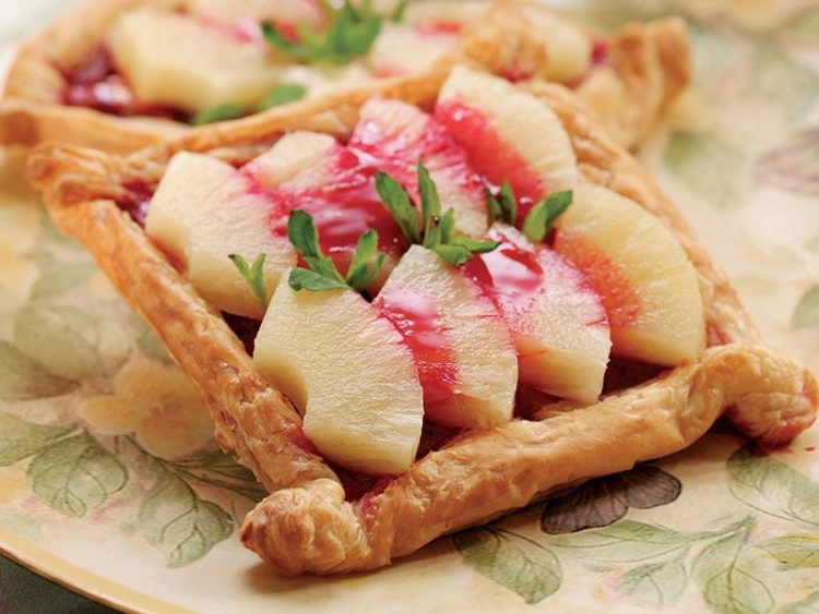 - Milföyleri fırından alıp vişneli karışımı yayın,dilimlenmiş ananasları yerleştirin..