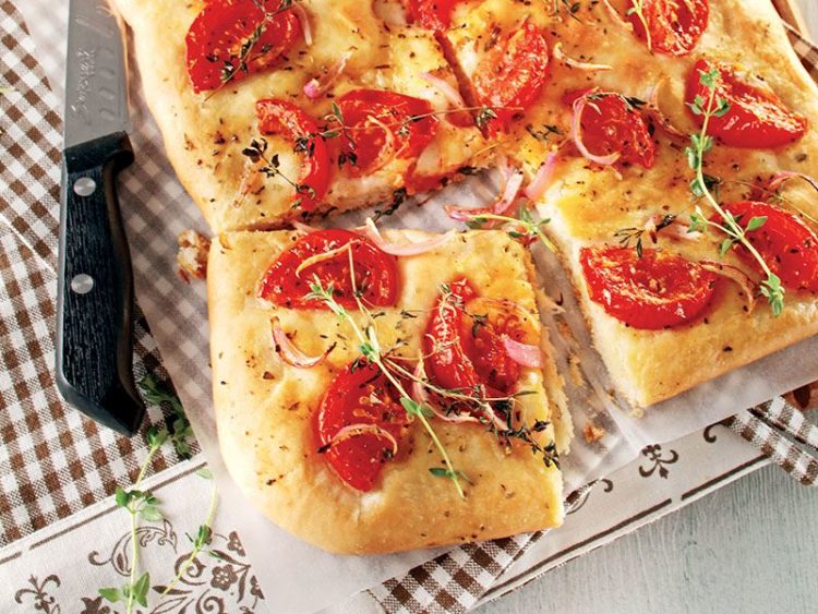 - Doğranmış domates, soğan, zeytinyağı, tuz ve biberi harmanlayıp hamurun üzerine yayın..
