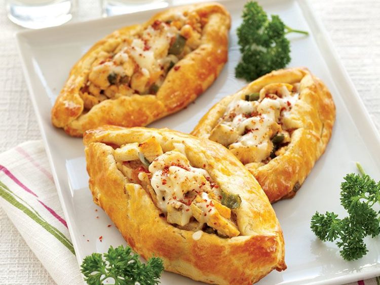 13. Tavuklu harçtan hamurun ortasına uzunlamasına yerleştirin ve kenarlardan katlayarak pide şekli verin..