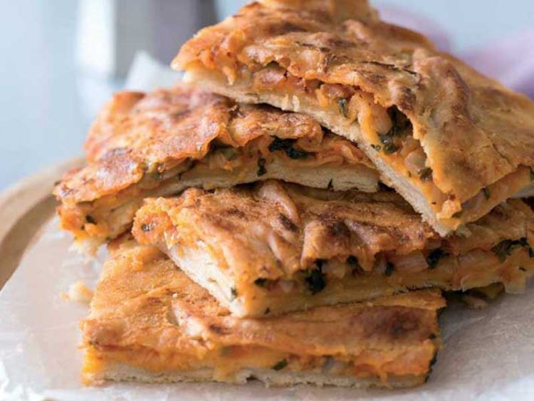 - Fırınlanan yufkayı diğer 3 yufkanın üzerine koyduktan sonra iç harcı yufkanın her yerine yayın..