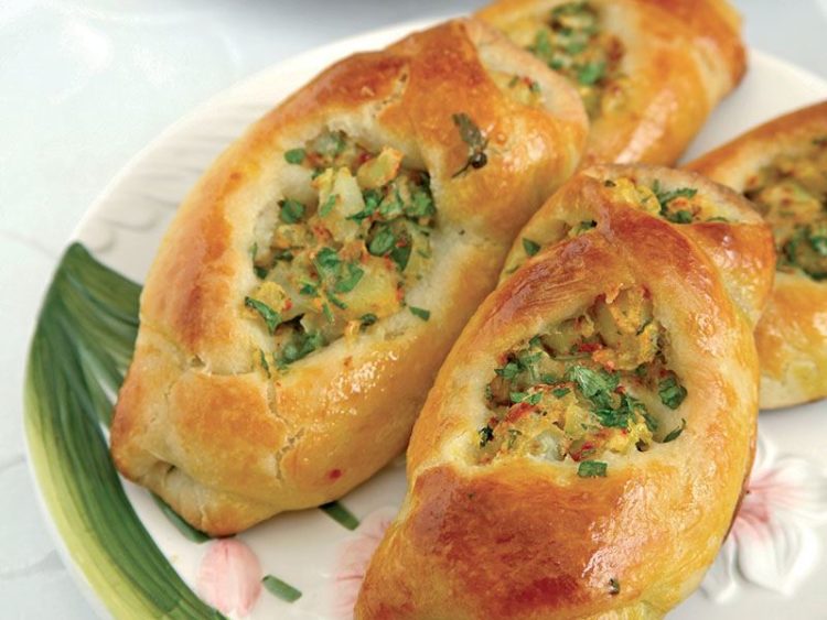 - Ortalarına patatesli harçtan paylaştırıp, hamurların iki tarafını havaya kaldırarak patatesli harcın üzerinden, kesik yerlerden hamurları birbirinin içinde geçirin..