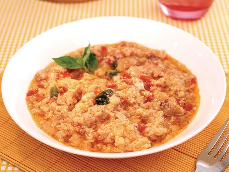 Bir tencerede tuz ve karabiber ilave edilmiş tavuk suyunu kaynatıp pide ekmekleri ve domatesli karışımı ekleyin..