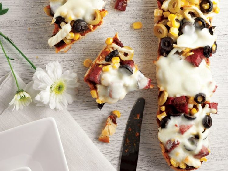 - Zeytinler, mısır, küp doğradığınız sucuk ve burgu peyniri geniş bir kasede harmanlayıp ekmek dilimlerinin üzerine paylaştırın..
