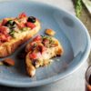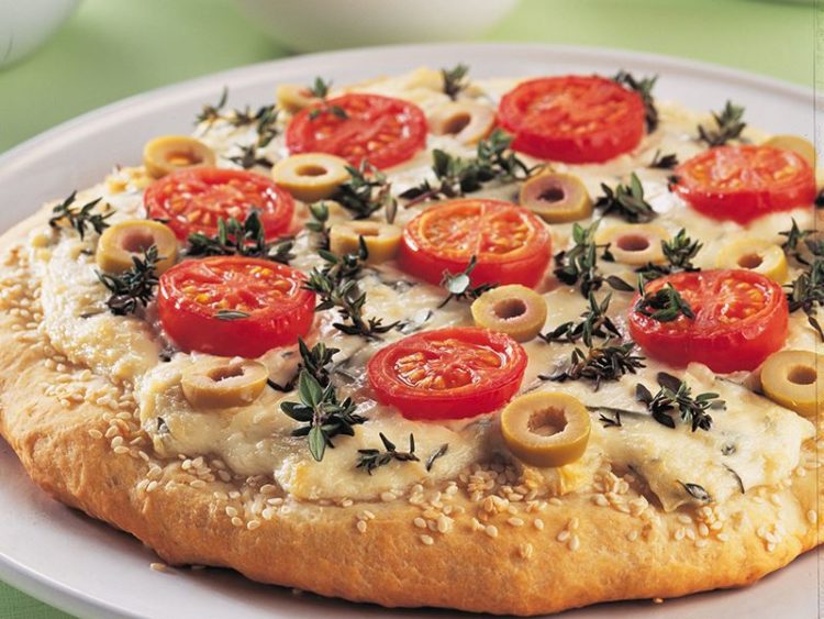 - Üzerine dilimlenmiş domates ve zeytin, taze kekik, biberiye ve karabiber ekleyin..