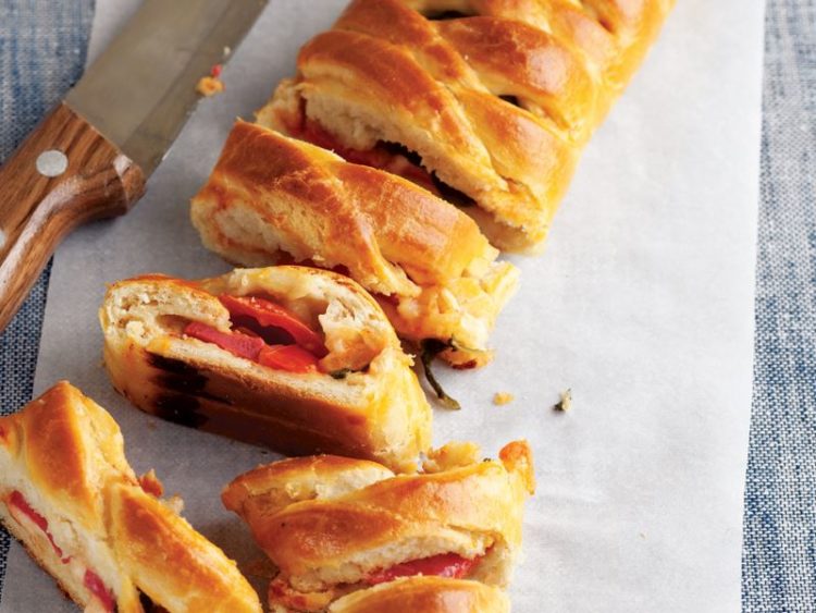 domatesleri koyup şeritleri hamurun ortasında birleştirin.. -