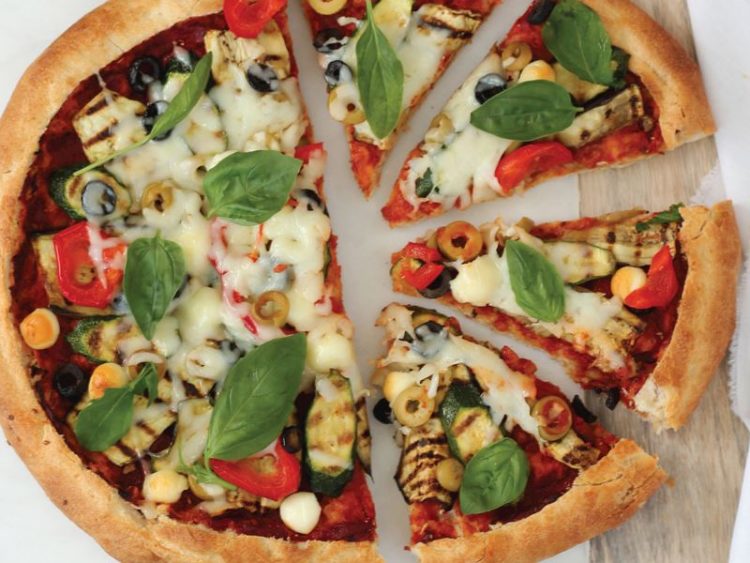 - Pidenin üzerine sırasıyla kızarttığınız patlıcan, kabak, dolmalık kırmızı biber, misket mozarella, mısır ve zeytinleri yerleştirin..