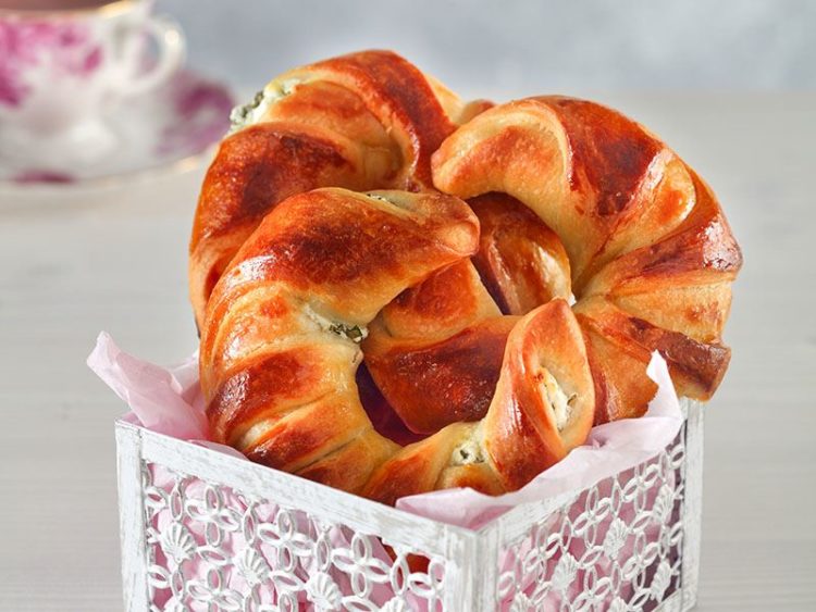 9. Geniş tarafına peynirli harçtan ekleyerek içe doğru sararak ay çöreği şekli verin..