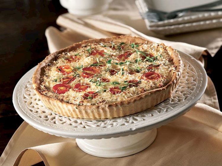 - Peynir karışımını tart tabanına doldurun ve üzerine kiraz domatesleri yerleştirin..