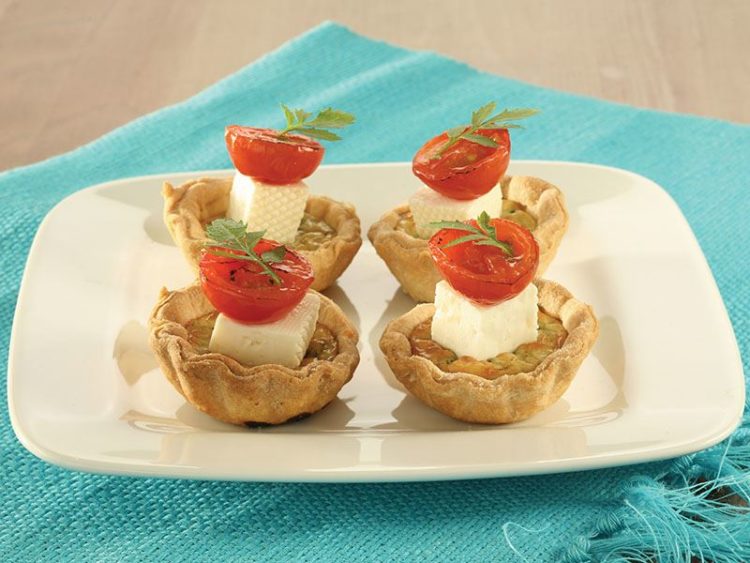 - Sert beyazpeyniri küp şeklinde doğrayıp tartöletlerin üzerine birer tane yerleştirin..