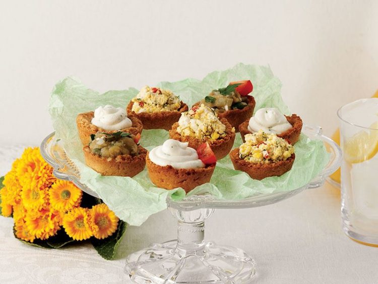 - Tartöletleri süzme yoğurt, baharatla tatlandırılmış patates püresi, patlıcan püresi ile doldurun..