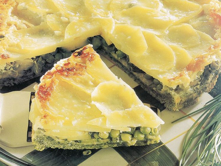 - Bezelyeleri ilave edin tekrar krema sürün ve patates dilimlerini dizin..